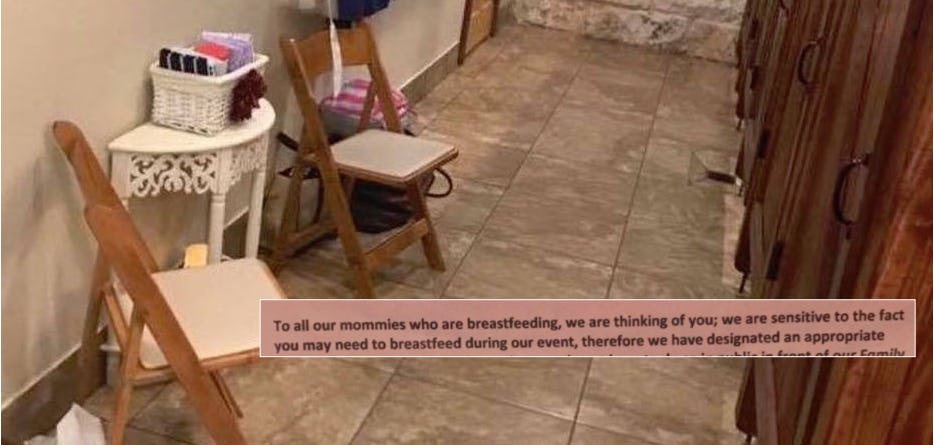 On the one hand, truly accommodating breastfeeding moms, of course, is the right thing to do. On the other hand, this couple did no such thing. Although they start out the note by insisting to the nursing ladies that "we are thinking of you," it quickly escalates to a much different tone from there. The almost menacing emphasis on refusing to burden their "Family and Friends" with the sight of a baby being fed, the revelation that the "comfortable and private area" is right across from the stalls in a public restroom, the "request" that it be used... none of it adds up to the normal, mostly reasonable (if over the top) wishes of soon-to-be newlyweds. It's rude, and it's the exact opposite of reasonable.