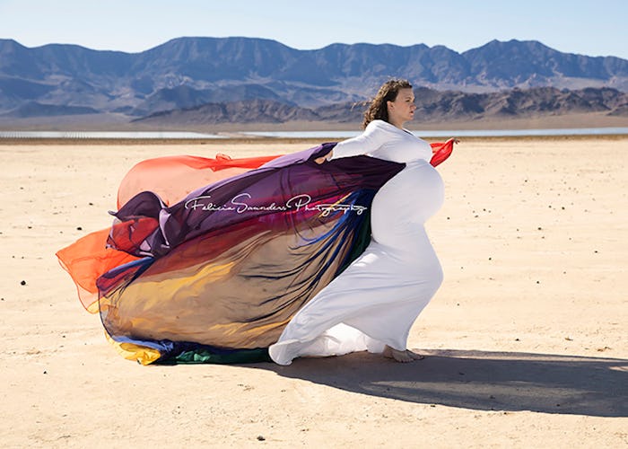 Saunders, who says she loves using her gift "to capture special tender moments" for her clients, set up the photoshoot in the Nevada desert. The backdrop is stunning, to say the least, especially since Brianna is wearing a rainbow cape cinched around a white dress. Thanks to the wind, the cape flutters beautifully behind Brianna, creating an effect that can only be described as breathtaking.