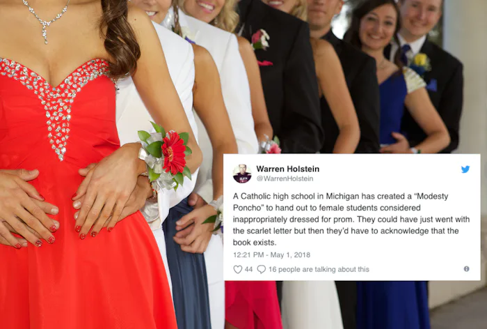 May is officially here! Which means if schools haven't already had them by now, high school proms are just around the corner. It's a night of dressing up, going out to dinner, dancing, and making memories with friends. Oh, and for a select few schools, it's a night of rampant, sexist body-shaming by teachers and school administrators. At these schools, they will be out like hawks, prowling for dress code violations: Dresses that are too short, that show "too much" back, or that have necklines deemed "immodest." However, for one Michigan high school, enforcing its dress code is approaching a whole new level. A Catholic high school joked about handing out "modesty ponchos" to girls who don't meet the dress code at prom, and Twitter thinks it's pretty ridiculous.