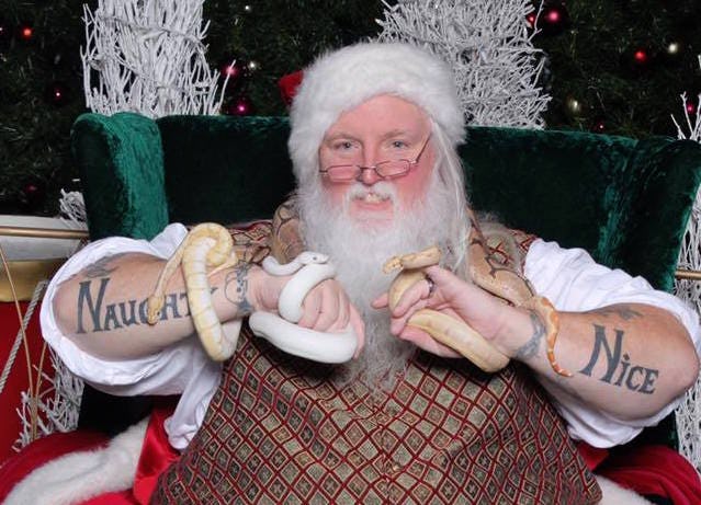 Maybe any burly man with a thick white beard and rockin' some red velvet can pass for Santa, but it takes that special something for someone to take the essence of Santa and make it into their very own. Such is the case for Scott Diethorne, affectionately known as "Santa Scott," a Pennsylvania mall Santa whose antics such as tossing kids over his shoulders for pictures, posing with all kinds of pets, and flashing his "Naughty" and "Nice" arm tattoos has earned him an enthusiastic fanbase and set him apart from the rest. This year, though, the beloved mall Santa was reportedly asked to tone down his act, much to the disappointment and outrage of his local following.