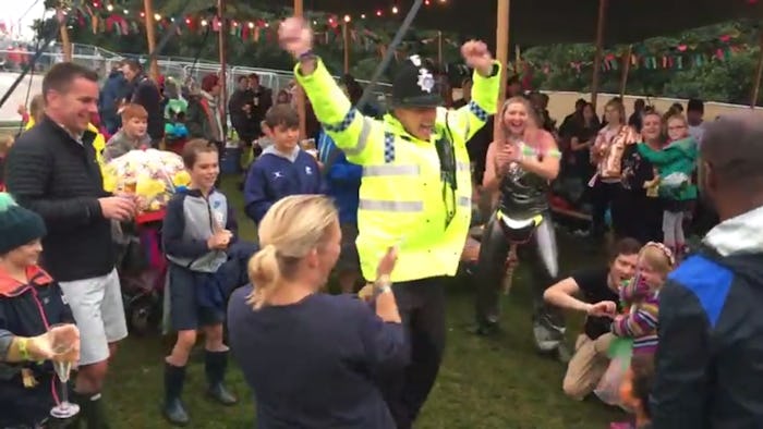 In the 28-second clip, captured by a colleague from the Dorset police force, Cox showed off his dance skills to OutKast’s “Hey Ya!” Festival-goers cheered, clapped, and danced along with the police officer as he strutted his stuff while in his florescent yellow uniform and helmet. Oh, and he was wearing glitter face paint, so that makes the video just so much more, dare I say, arresting.