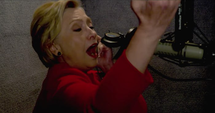 "No, we're not doing that. Get the f*** out of here," the ladies shoot back. "Yo Hillary Clinton, take us home!" Enter: Hillary Clinton belting out — proving that she's not just going to "shut up" after her election loss, as Sen. John McCain has called on her to do, according to People. Although I'm pretty sure it's not Clinton's actual voice, her cameo is epic nonetheless. And it's exactly what we need to end this mess of a year on a high note. Here's to 2018 — ay women continue to kick a** and take names — only with infinitely less sexism, sexual misconduct, oppression and mansplaining.