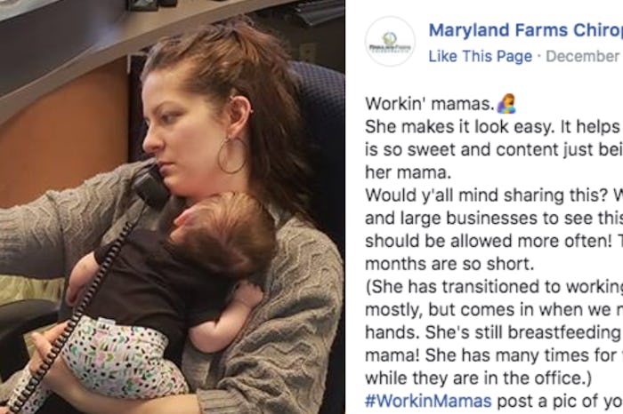 Maryland Farms Chiropractic posted the now-viral photo to its Facebook page, showing Melody Blackwell at her desk with her infant daughter along with the hashtag #WorkinMamas. "She makes it look easy. It helps that Baby Nora-Jo is so sweet and content just being with and near her mama," the caption read.