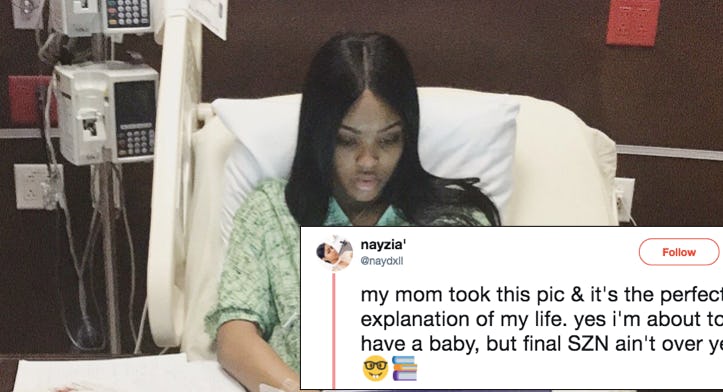 This photo of the mom has been circulating on Twitter for a very good reason — it highlights just how strong and powerful women are, especially during the times of extreme stress (from multiple places). In the photo, new mom Nayzia Thomas sits in a hospital bed, looking calm and collected, while an open textbook sits at her side and her laptop remains poised on her lap.