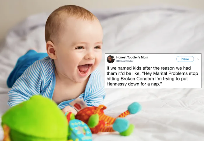 Bunmi Laditan, the writer and mom behind Honest Toddler's Mom Twitter feed, got to thinking the other day about what it would be like if parents named their kids after the reason they had them. For example, my sons would be named "Forgotten Birth Control Pill," "My Kid Needs A Sibling," and "This Will Fix My Marriage, Right?"