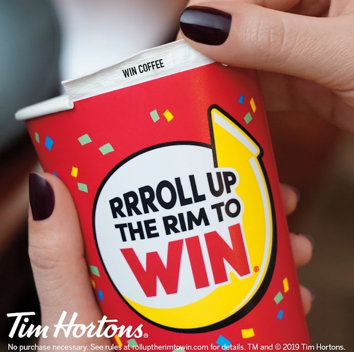 But what's amazing about Tim Hortons' Roll Up The Rim To Win contest is that you don't have to give away your email to spammers to win. All you have to do to play? Just head over to your favorite Tim Hortons and buy a "freshly brewed coffee, handcrafted espresso beverage, or hot chocolate in a medium, large, or extra-large," according to the Associated Press. Once your drink is finished, "roll up the cup rim to see if you’ve won."