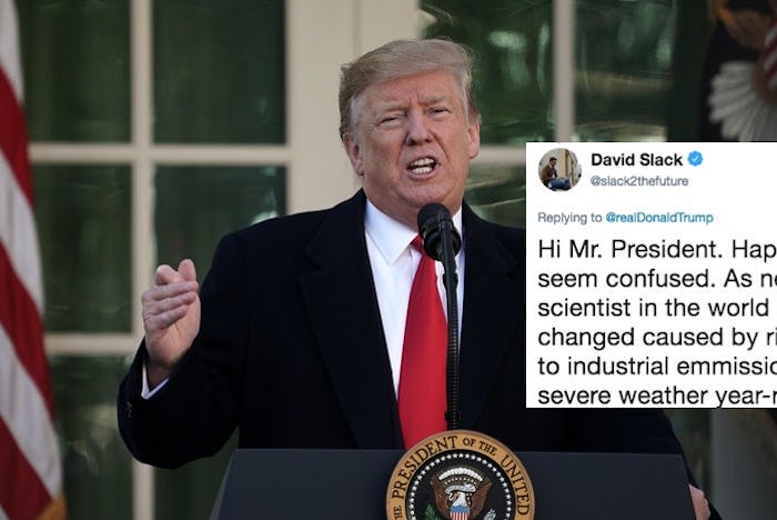 "Hi Mr. President. Happy to explain since you seem confused. As nearly every legitimate scientist in the world agrees, global climate changed caused by rising temperatures due to industrial emissions results in more severe weather year-round — including harsher blizzards," one person responded.