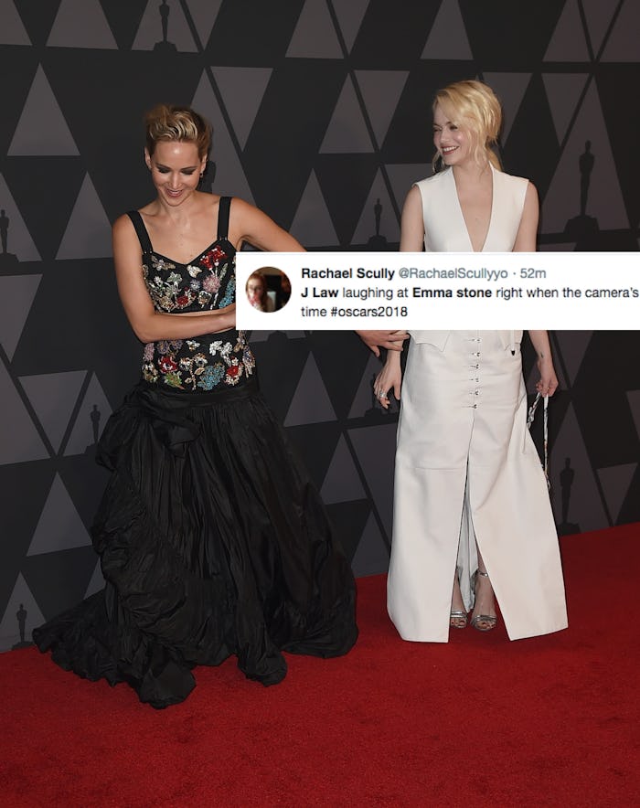 It's the little things during the Academy Awards that really make the night. Everyone expects the gorgeous fashion and the long speeches, but it's the surprises that stick in your memory for years. And these tweets about Jennifer Lawrence laughing at Emma Stone at the Oscars prove that this blink-and-you'll-miss-it moment was one worth paying attention to.