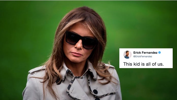 In the now-viral photo, Melania crouches by a table of kids who all look suspicious to say the least. And the Twitter commentary of imagined narrations of the kids' reactions? Totally priceless.