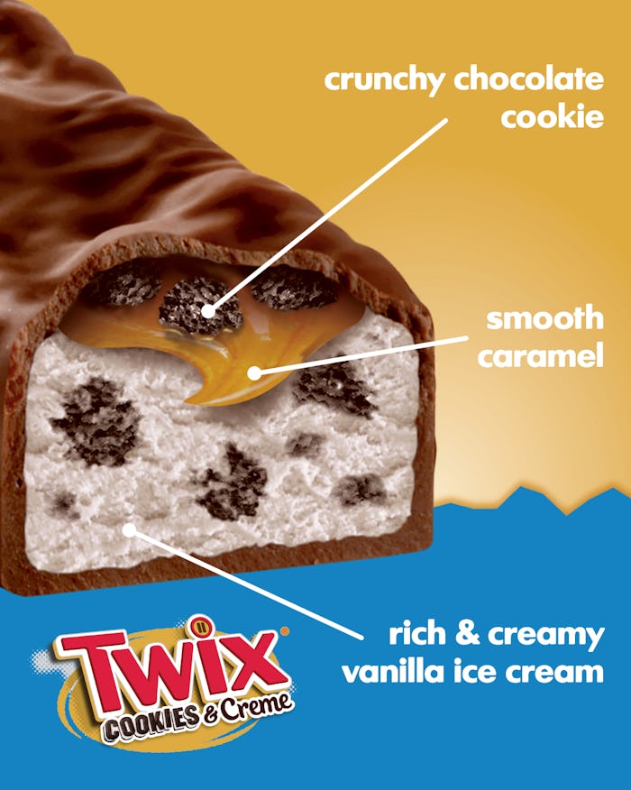 The best part about these new ice cream bars? You won't have to choose between a left TWIX or a right TWIX to enjoy them. Each bar features creamy vanilla ice cream filled with chocolate cookie pieces, topped with crunchy cookies pieces and caramel. Just like the candy bar, each ice cream bar is completely coated in delectable milk chocolate.