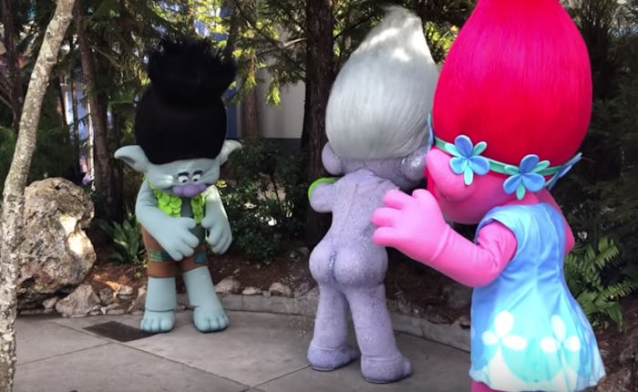 According to Attractions Magazine, Poppy and Branch have been doing meet and greets with guests for a while now at Universal Studios Florida. However, the park recently added another beloved troll to the line-up: Everyone's favorite auto-tuned, bare-bottomed, glitter-tastic troll, Guy Diamond. And get this: He literally farts glitter! Ahead of the meet and greet event, the troll trio dances for guests — culminating with a poof of glitter from Guy's naked behind, Inside the Magic reported. A video of the dance, which was shared by the magazine's YouTube and Twitter accounts, has managed to attract a fair amount of attention. Check it out for yourself!