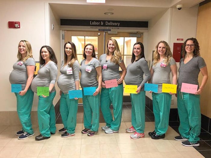 A medical center in Maine is expecting an exponential increase of newborns in its labor and delivery unit, but not for the reason you might think. Earlier this week, the hospital posted a now viral photo of several pregnant nurses who work together at Maine Medical Center in Portland and who are all due between April and July of this year, according to CNN. A total of nine nurses — eight of whom are pictured showing off their bumps in the viral photo — are expecting a bundle of joy in the upcoming months.