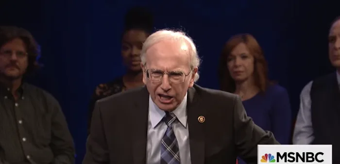 Interestingly, the set-up of the sketch focused on Rachel Maddow's Democratic Forum debate from Friday night — a program that didn't quite command the attention of other debates from earlier in the campaign season. (Though ratings have not yet been released.) But even if not everyone might have understood specific references from the Forum that they likely didn't watch, there were still plenty of highlights in the sketch — Taran Killam pulling double-candidate duty as Martin O'Malley and, later, Trump, Kate McKinnon's hilarious bit of physical comedy as Hillary Clinton trying to look chill, and, of course, Larry David as Bernie Sanders. Honestly, if the statement, "I'm Bernie Sanders, and I want your vacuum pennies!" doesn't make it into your regular vernacular, then you're just simply not a true American.