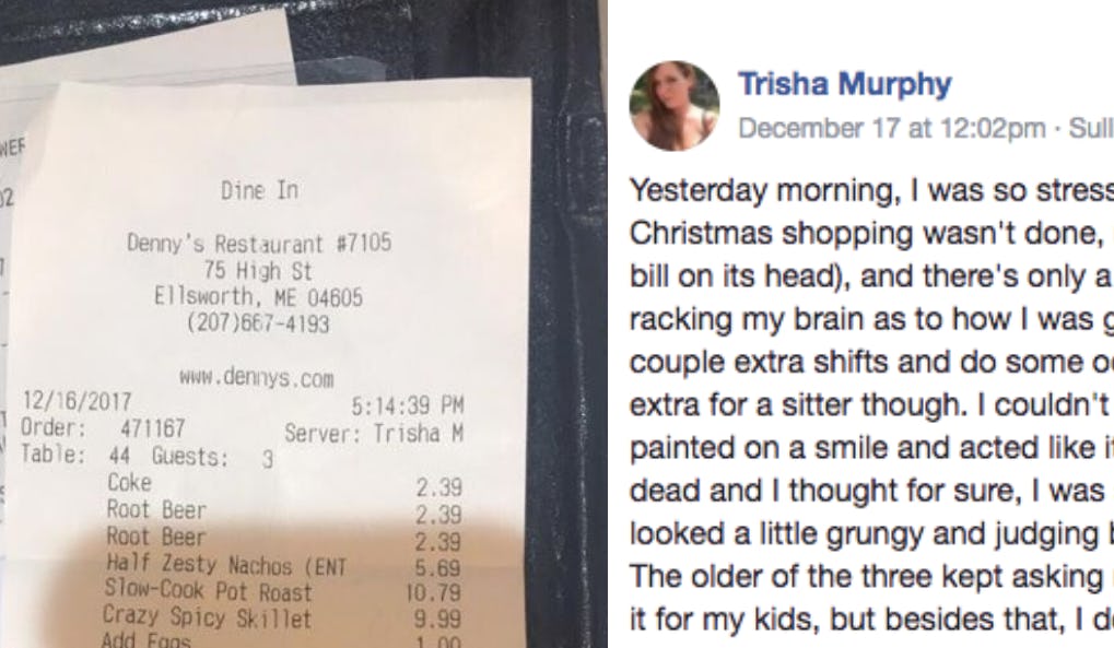 Trish Murphy, a single mom and Denny's waitress in Maine, went to work more than a little bit stressed. In her Facebook post about her day, Murphy explained that her car had been towed to Bangor, leaving her with a $735 bill. The large bill forced her to work extra shifts, pick up odd jobs, and spend most of her income on a sitter for the extra shifts. After all of that, she wasn't sure how she would make Christmas happen for her family.