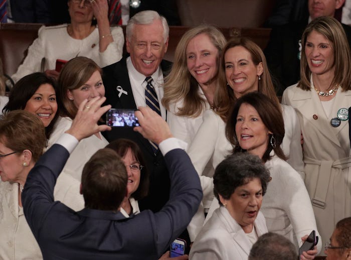 Representative Jim McGovern of Massachusetts was also pretty pumped to join in on the united movement. "Proud to wear a white ribbon tonight in solidarity w/ the women of the 116th Congress," the democrat wrote as the caption of his retweet. He made sure to add that it was the 19th Amendment's 100th anniversary, too. Within the retweet was a picture of the notable House Democrats in white, with representative Alexandria Ocasio-Cortez front and center.