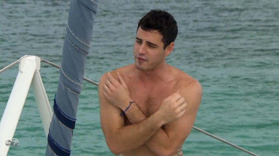 Aside from seeing Ben's tattoo this week, fans also saw Caila's confusing love confession, a group of "aggressive pigs," and the departure of Jennifer, Leah, Olivia, and Lauren H. Or so Emma Gray, Claire Fallon, and Katelyn Bogucki of the Huffington Post podcast "Here To Make Friends: A Bachelor Recap Show" tell me. And with just six girls — and one tattoo — remaining, anything could happen. Like anything! (Though I'd love to see some "mild manatees" make an appearance.)