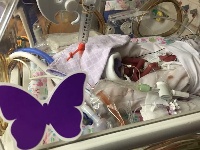 When my son had to stay in the Neonatal Intensive Care Unit (NICU) after he was born, I saw a variety of different decorations on the babies' bassinets, including stickers, name cards, and family photos. And then I noticed a single purple butterfly on a baby's crib, and had no idea what it was or why it was there. So I asked our NICU nurse what it meant, and she told me the heartbreaking, but important, significance of this symbol for NICU parents.