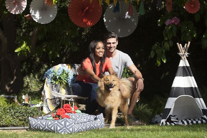 Copper is a two-year-old rescue dog who Rachel has had since at least January, but it seemed like the injury was new. In the season premiere, we saw shots of him without the cast running around Rachel's private suite on the show. But as Rachel prepared to embark on her first one-on-one of the season with Peter, the gap-toothed business owner, she asked if she could bring along a friend who had recently been in an accident. Peter consented, and out of the limo bounded a (hobbling) Copper with a sparkly cast on one of his four legs!