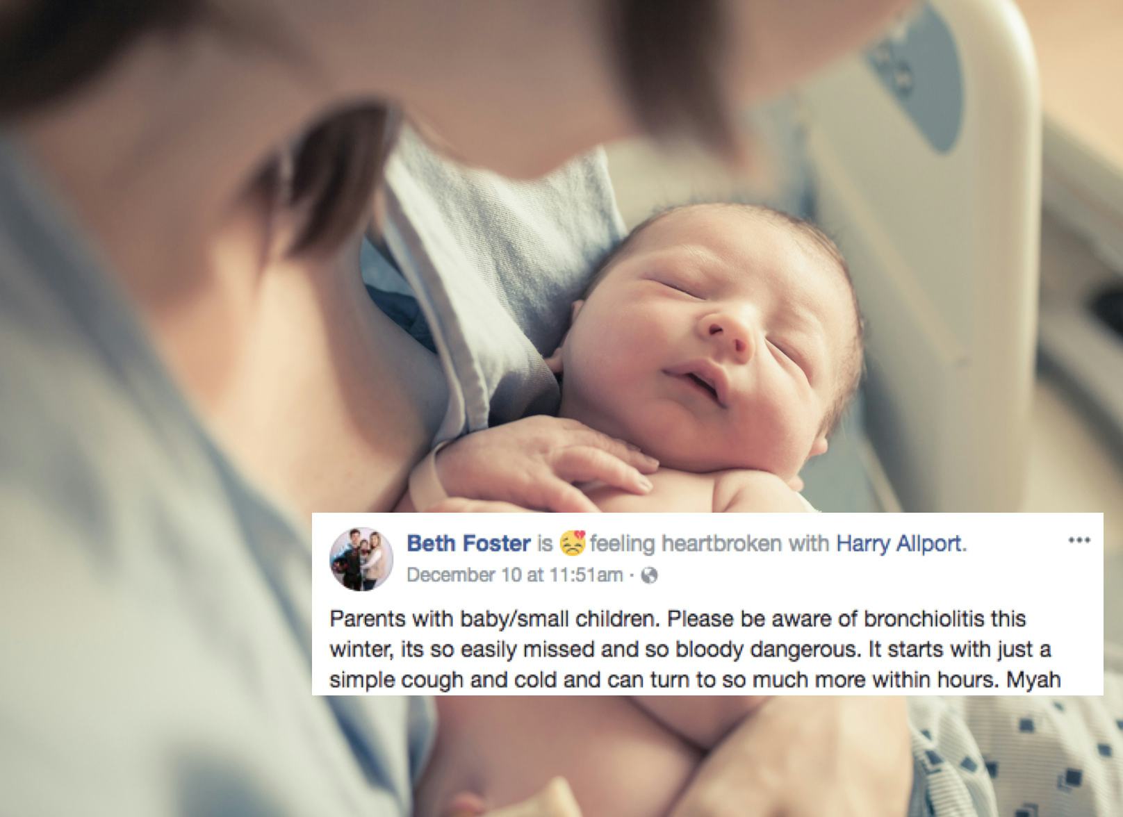 Mom Beth Foster posted her own harrowing account of her daughter Myah's experience with bronchiolitis to her Facebook page. She explained in the post that Myah began with a bad cough and "normal cold symptoms," that escalated to coughing fits that "turned [her] purple through lack of breath." She wrote: