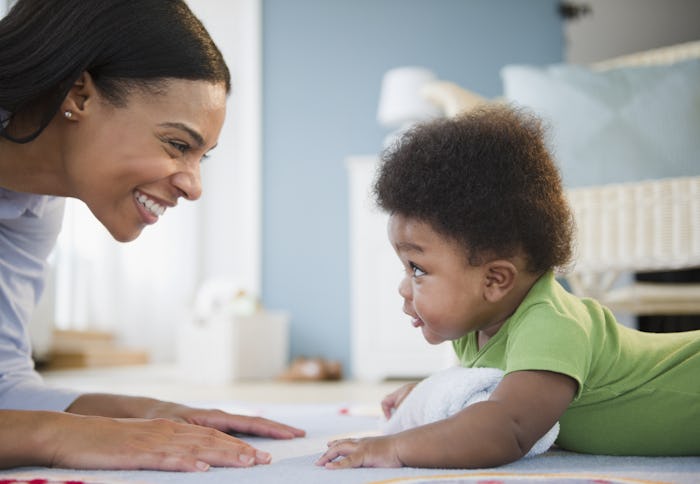 That said, there are things you can do to help your baby move from babbling to speaking words. As explained on What To Expect, one of the easiest ways to foster language development is to talk back to your baby's babbling as though you're holding a conversation. For instance, if your baby starts chanting "muh-muh-muh" you might repeat the sounds and encourage your baby to respond. This nonsensical conversation may feel silly, but you're encouraging your little one to keep vocalizing and improving his language skills.