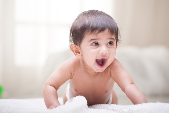 But the "10-month" sleep regression is not actually limited to the tenth month, points out Marietta Paxson, sleep consultant at Little Dreamers. Paxson tells Romper that the phase is sparked by gains an infant suddenly makes in physical milestones, like crawling and pulling up, as well as language absorption and the emergence of teeth. Since these vary widely from child to child, sleep regression can actually occur anytime between 7 and 11 months.