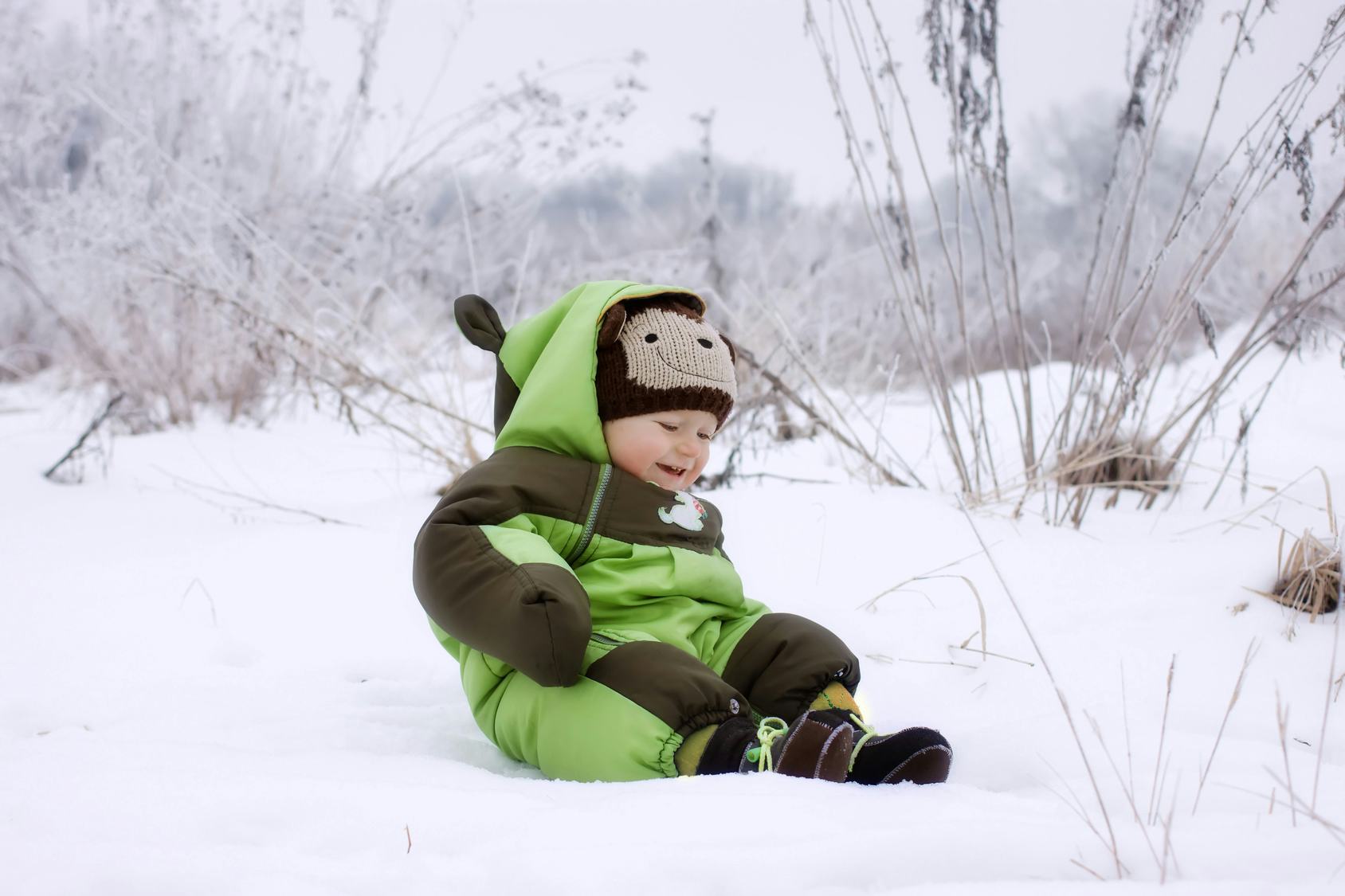 In addition, it's smart to use a waterproof one-pice snowsuit if your kid is going to be in the snow for any length of time. It's an easy way to keep your baby dry and warm when exploring this new wintry environment. Really, few things are worse than feeling both cold and wet, so the snowsuit is a must.