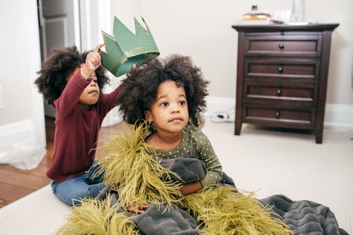 "This is the classic type of play in the toddler to preschool years when children might act as their favorite pretend or fantastical characters," Dr. Jack Maypole, pediatrician, tells Romper. "Their play may be a solitary endeavor, with the young hunter walking the woods alone, or they may play with family members or friends to create plots and characters that can last for minutes or years."