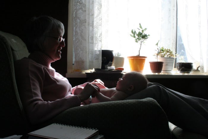 My dad wasn’t a hands-on parent with any of his kids, especially in early infancy, and the same held true for his granddaughter. A month after my daughter was born, he left to spend the cold winter months in Texas. With snow piled high around our little house and temperatures too cold to bring a tiny baby into, the three of us, my mom, the baby, and I, developed a routine. I’d text her from my room in the basement every morning at 3 a.m. She’d rouse herself from sleep, come downstairs, and take the baby for a few hours, so I could get some rest. We ate dinner at the table, with the baby in her rocker next to us. We watched The Office on my laptop while we ate because she’d never seen it before. When my kid was 8 weeks old and it was time for me to go back to work, my mom became my babysitter. When I had long shifts, she’d bring the baby to nurse during my lunch breaks.