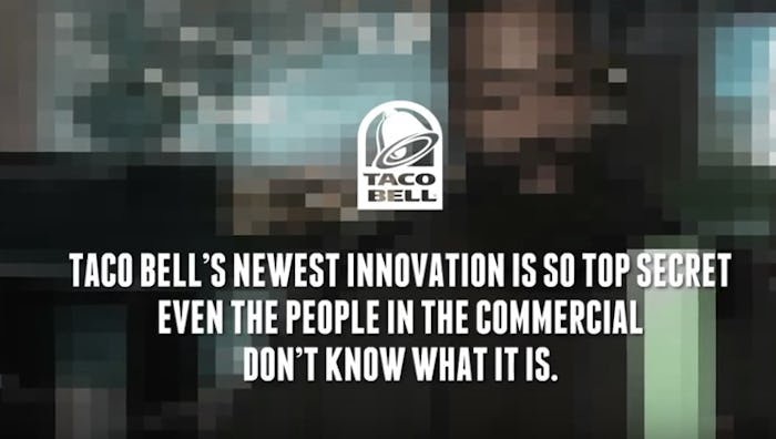 Taco Bell certainly knows how to keep viewers guessing. The whole schtick of its 2016 Super Bowl commercial, at least the version released in advance of the big game, is that, as the commercial states explicitly in text at the beginning of the ad, "Taco Bell's newest innovation is so top secret even the people in the commercial don't know what it is." Now that the commercial has aired and the product is finally revealed, the question on every Taco Bell fan's mind is: where can you get Taco Bell's Quesalupa?