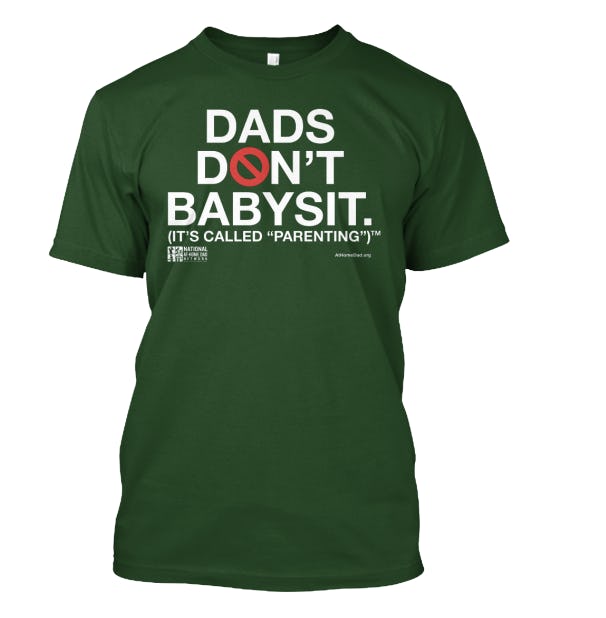 The t-shirt, created by the National At-Home Dad Network, is available on Teespring. There are multiple sizes and colors, and there are options for men, women, children, and babies (with the slogan adjusted accordingly to "My dad doesn't babysit"). Proceeds will go towards the National At-Home Dad Network's scholarship fund, so that more lower-income fathers can attend the network's Annual At-Home Dads Convention.