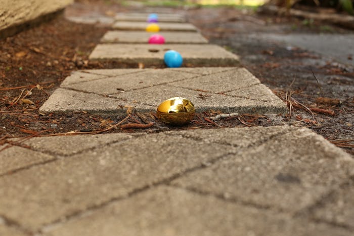 OK, so on to the eggs. Unfortunately, unlike with Christmas preparations, in most places you can't hide Easter eggs the night before, because what if it rains? So you've got to get up early — like, at crack of dawn early — to tuck those pastel-painted eggs behind tufts of grass. But scoping out your hiding spots in advance can save you time later, so take a look around your backyard now. Do you have a sandbox? If so, World Market's blog suggested burying Easter eggs for your kids to dig up. What about a swing set or other play gear? You can balance an egg in a stuffed animal's lap and prop them up on a swing or at the top of a slide. Creative Atmospheres also recommended hiding eggs among the gardening supplies — tucked inside your gardening gloves, the watering can, or inside a pot.