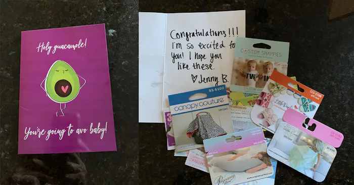 The cards feature a cartoon avocado on the front and read "Holy guacamole! You're going to avo baby!" And the inside of the card reads, "Congratulations!!! I'm so excited for you. I hope you like these." It's signed simply, "Jenny B."