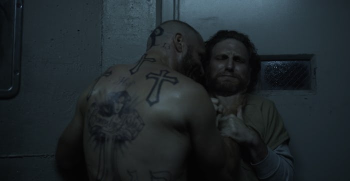Well, that was certainly one way to kick off the beginning of Season 4 of House of Cards. Though Lucas Goodwin's fate was left fairly up in the air (we knew he was headed to jail, but where?), I definitely wasn't expecting to meet his roommate so, uh, intimately. Because this is House of Cards and there's no one introduced on the show who doesn't serve a greater purpose, I wondered who is Lucas Goodwin's tattooed prison cellmate, and beyond that, why'd we have to creep up on the guy when he was in the middle of doing his thing? (Spoilers ahead for Season 4, Episode 1 of House of Cards.)