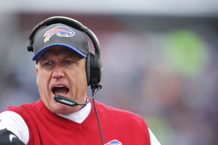 In only seven months the 2016 race for the White House will be finalized, but until then the fight continues with candidates campaigning for support from the general electorate and some pretty public figures. Republican presidential candidate Donald Trump has dominated the headlines with his outlandish proposals and has gained the support from Hollywood celebs like Charlie Sheen, Tim Allen, and Vince Vaughn. Now, the billionaire has a bit more support — NFL Buffalo Bills head coach Rex Ryan will introduce Trump at his rally at Buffalo’s First Niagara Center on Monday night. Trump currently leads the polls, so while he may not need Ryan’s help to get ahead on the eve of New York’s Tuesday primary, Ryan’s support can’t hurt his chances upstate. So, who is Rex Ryan and why his relationship with Trump so messy?