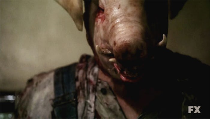 As of yet, we really only know two things for sure about the Pig Man: He's a ghost, and he's a dude with a pig's head on his head. The pig's head looks like it's just the head of a dead pig over his own, like a sort of macabre costume, but maybe the head was actually sown on to replace his own. This is, after all, the same American Horror Story that gave us the minotaur man, so I don't put anything past them when it comes to body horror.