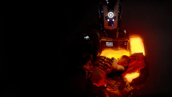 "In the very early conversations between Michael [Lloyd Green] and I about what this film was going to be, as the image of a hard-surfaced robot holding a baby,” Sputore said. The director then revealed that they both wanted to highlight the aesthetic differences and intellectual similarities between humans robots.