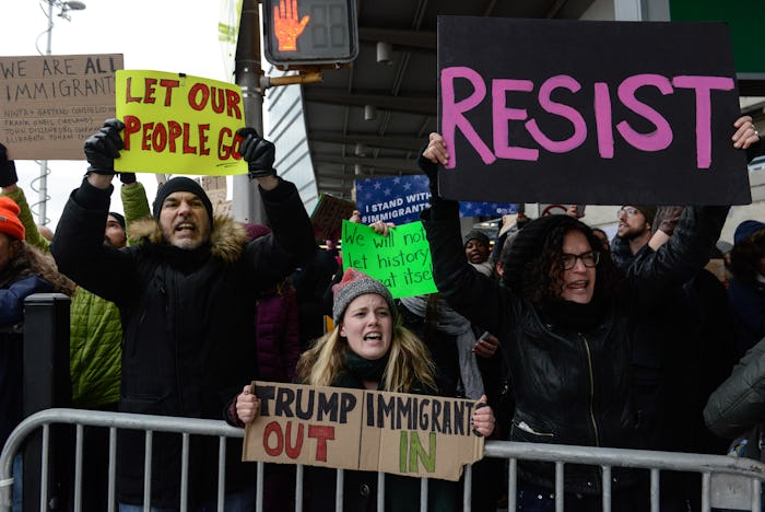 A small crowd gathered at New York's John F. Kennedy International airport Saturday morning after news broke that two Iraqi refugees were being detained there as a direct result of President Trump's recent executive order. By the end of the night, the airport was packed with people standing in solidarity with the refugees. The protestors spilled into the streets outside the terminal and filled up three stories of a nearby parking garage. Even the New York Taxi Workers Alliance, a nonprofit organization that represents New York taxi drivers, joined in by announce announcing a one-hour strike to show their support to the protestors at JFK. However, while many drivers stood by the strike and refused fares, some Uber drivers reportedly continued to pick up riders — a decision that led some on Twitter to protest. Others even began deleting their Uber accounts.