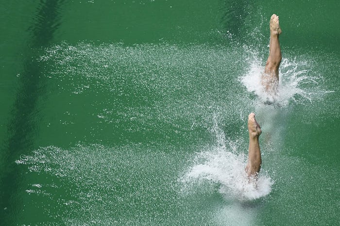 On Tuesday, the water in the pools at the Maria Lenk Aquatics Center, where the diving, water polo, and synchronized swimming action is going down, turned a bright, bright green — not at all the nice, healthy, heavily chlorinated blue that is normal and expected. After some dismayed speculation splashed its green, green waves over social media, FINA, the international body that governs swimming and diving offered competing explanations as to why, eventually issuing a statement that it had run out of chemicals used in the water treatment process, but insisting that everything was still A-OK.