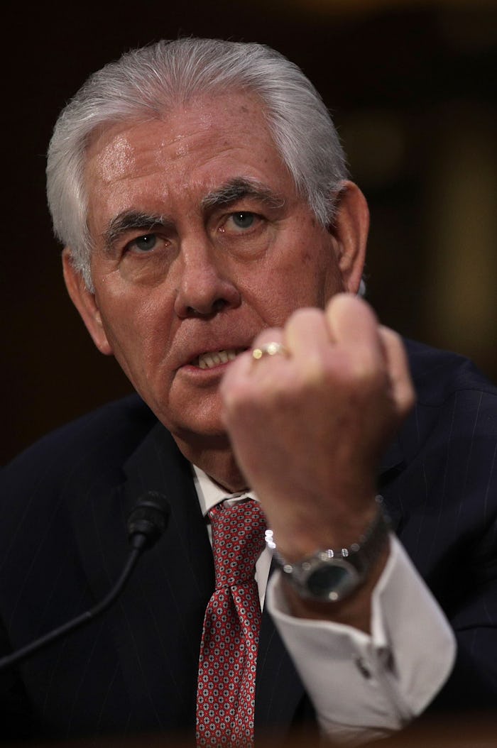 This doesn't bode well for Rex Tillerson, who is expected to take over the department by the end of next week. His nomination was approved by the Senate Foreign Relations Committee on Monday, and according to The Hill, Majority Leader Mitch McConnell is pushing for the full Senate to vote soon. It's assumed that the Republican-majority Senate will vote him through, barring the unlikely event that three or more stray from party lines (click here for your senator's phone number).