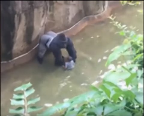 According to that report, at around 4 p.m. on Saturday afternoon, police and emergency crews responded to reports that a 4-year-old boy had fallen into an exhibit at the Cincinnati Zoo. In an official statement posted on the zoo’s website, officials confirmed that the child had climbed through the public barrier at the Gorilla World exhibit. The child was unhurt by the fall and two female gorillas in the exhibit were immediately recalled by their handlers, according to the statement. But a third gorilla — a 17-year-old male named Harambe — grabbed the boy and began dragging him around, Cincinnati.com reported.