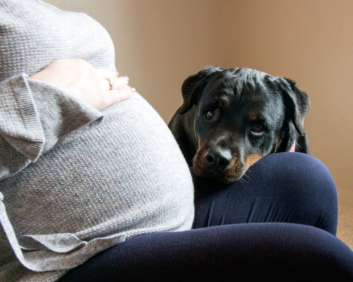 There are a few different behaviors which suggest that dogs might have figured out there's a bun in the oven, according to Pedigree. An increase in affectionate or protective behavior is common, or, in dogs who aren't keen on the change, more episodes of acting out (including regressions, chewing new items they connect with the upcoming baby, and a generally non-cooperative attitude). It's very individual to the pup, but as Franklin says, how your pet will react if they sense your pregnancy varies by individual.