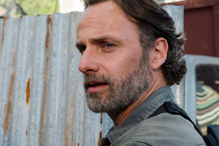 At the end of the trailer for the upcoming season of The Walking Dead, there's an intriguing glimpse of Rick looking practically nothing like himself. His hair is cropped shorter than usual and he's got a bushy, gray beard. It's definitely a hard pivot into a post-apocalyptic Santa look that no one would have ever expected from Rick. But why is Rick old in The Walking Dead Season 8 trailer? There are a few potential explanations, but the most plausible is that there's a time jump at some point in the season — and that's especially likely if the show follows the comics.