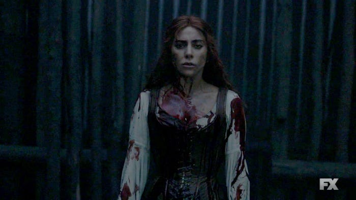 But we didn't learn Gaga's character's name or her backstory until "Chapter 4," which revealed that she was Scáthach, a formerly human Englishwoman who immigrated to American way back when and became some sort of goddess-demon-witch-nymph through a vague and unclear process in which she slaughtered some colonist soldiers to escape and satiate "ancient gods." So, basically, we still know little to nothing about her, other than the fact that she's super spooky, has a great accent, and desperately needs a shower.