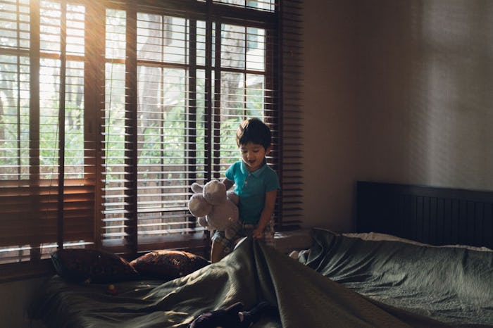 "It is absolutely more difficult for a toddler to go to sleep when it is light out," explains Nicole Johnson, president and lead sleep consultant for The Baby Sleep Site, an established sleep consulting service based in Ohio. She tells Romper, "Light stimulates our eyes to signal our brain when it's time to wake or sleep. With the sun setting later, your toddler is likely to 'fight bedtime' when they are trying to communicate that they are unable to sleep at this time of day right now."