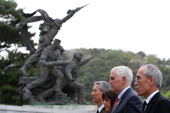 During his visit to the capital city on Monday, Pence said that the Trump administration will continue to use "peaceable means" to pressure North Korea into abandoning its nuclear program, according to NPR. But "all options are on the table" for the U.S. in regard to North Korea's nuclear program, he said during a joint news conference with South Korean President Hwang Kyo-Ahn.