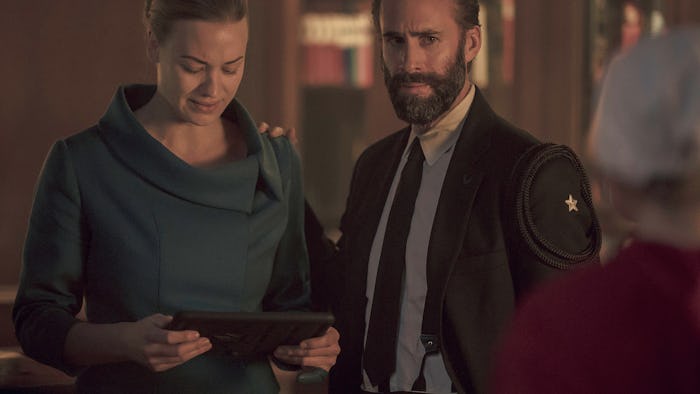 The dynamic between Commander Fred Waterford and Serena Joy on The Handmaid's Tale is complicated at best. Although they emerged as a united front in the series opener, the events leading up to the second season finale tore them apart and the Season 3 premiere showed just how much damage had been done. Following two catalytic conversations with her mother and June in "Useful," Serena plunged herself in the sea — seemingly reborn. But does this mean Waterford and Serena will get back together on The Handmaid's Tale or will Serena ride off into the sunset alone? As always, the answer isn't as straightforward as fans would like to think.