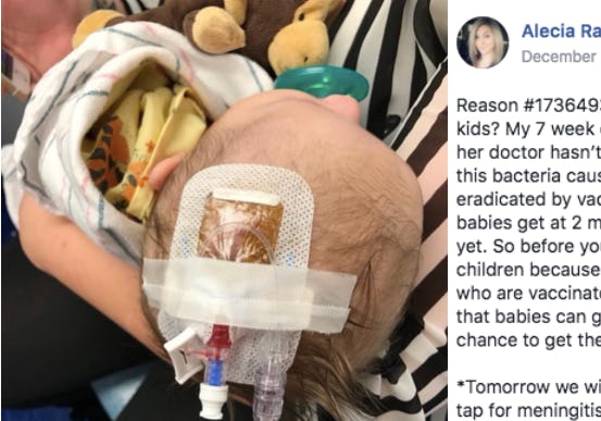 "Reason #1736493983283763 to vaccinate your kids? My 7 week old niece has HIB flu," Rankin, the aunt on a mission, wrote on Facebook. "So rare that her doctor hasn’t seen it in her career because this bacteria caused by HIB flu was all but eradicated by vaccines. The first being the one babies get at 2 months, which she hasn’t gotten yet." Rankin continued: