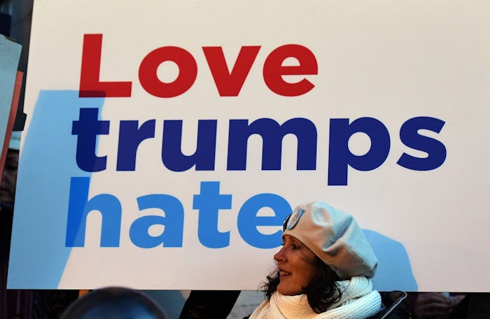 If you don't want to come up with your own statement, there are plenty of popular slogans to choose from. Originality is eye-catching, but hearing the same phrase over and over again can help cement it in people's heads and hearts. "Love Trumps Hate." "My Body, My Choice." "Black Lives Matter." "Women's Rights Are Human Rights." "Not My President."