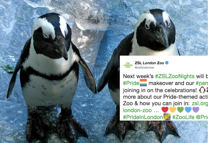 If you haven't heard of them before, Ronnie and Reggie are a Humboldt penguin couple at the ZSL London Zoo. And as CNN reported, the zoo will be giving its July 5 Zoo Night event a "Pride makeover." According to a news release from the ZSL London Zoo, the event will include an opportunity to learn about gender and mating in the animal kingdom during a Pride-themed talk, where "they'll discover just how common same-sex pairings are." On Sunday, July 7, families can also attend a storytelling show by drag artist Mama G — during which she'll share stories about "being who you are, and loving who you want."