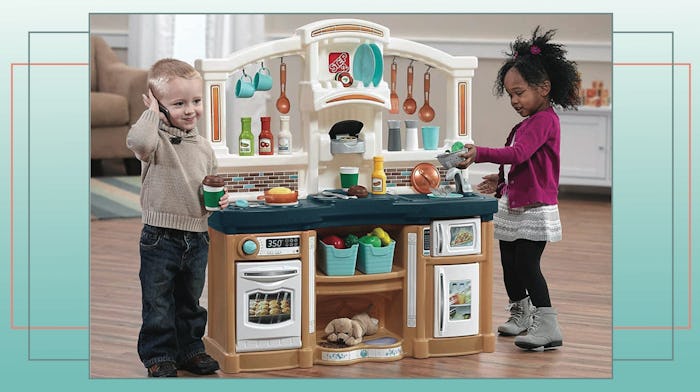 For small play areas, this toy oven brings plenty of fun in a tidier package. This is a plastic stovetop and burner, rather than a full kitchen, but it’s loaded with realistic lights and sounds that appeal to any tiny chef. The burners “turn on,” the water “boils,” and the oven light turns on when it’s opened. The burner dials actually turn, and the oven is designed to be deep enough to hold all its 11 accessories: four cookies, a cookie sheet, a fried egg, a piece of bacon, a steak, a frying pan, a spatula, and a towel. With over 2,000 reviews, shoppers commented this toy took just minutes to assemble.
